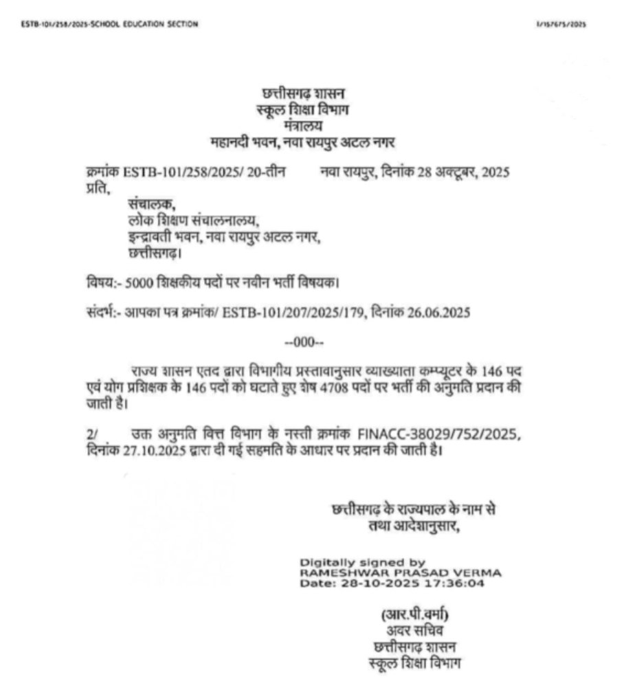 दिनांक 28 अक्टूबर को स्कूल शिक्षा विभाग के अवर सचिव आर. पी. वर्मा ने छत्तीसगढ़ के राज्यपाल के नाम तथा आदेशानुसार संचालक लोक शिक्षण संचनालय को आदेश क्रमांक ESTB-101/258/2025/20-तीन जारी करते हुए कहा है कि “दिनांक 26 अक्टूबर को आपके द्वारा प्राप्त पत्र क्रमांक ESTB-101/207/2025/179 के अनुसार राज्य शासन एतद् द्वारा विभागीय प्रस्तावानुसार व्याख्याता कम्प्यूटर के 146 पद एवं योग प्रशिक्षक के 146 पदों को घटाते हुए शेष 4708 पदों पर भर्ती की अनुमति प्रदान की जाती है। उक्त अनुमति वित्त विभाग के नस्ती क्रमांक FINACC-38029/752/2025, दिनांक 27.10.2025 द्वारा दी गई सहमति के आधार पर प्रदान की जाती है। इसप्रकार पहले जहां 05 हजार शिक्षक पद पर भर्ती होना प्रस्तावित था वहीं अब केवल 4708 पद पर भर्ती प्रक्रिया की जाएगी।
