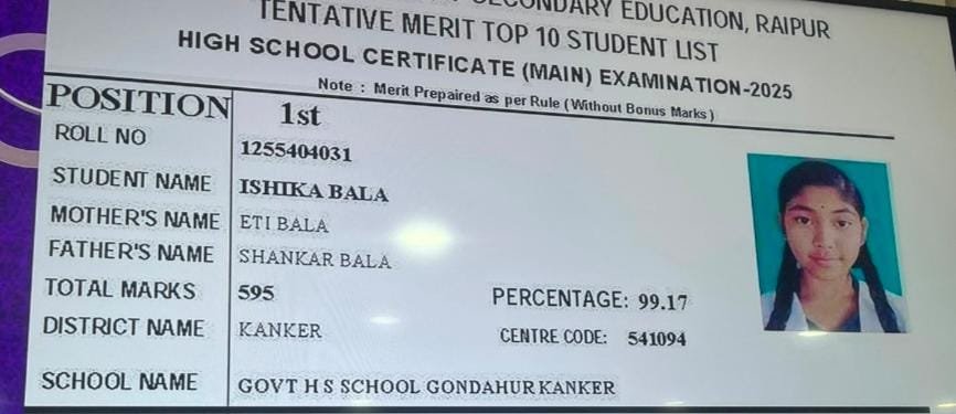 कोयलीबेड़ा: मुख्यमंत्री विष्णुदेव साय ने आज 10 वीं-12 वीं बोर्ड के नतीजे जारी किए. इसमें 10 वीं कांकेर की इशिका बाला ने टॉप किया. 10 वीं में टॉप करने वाली इशिका को ब्लड कैंसर हैं और वे इससे जंग लड़ रही है.जानकारी के अनुसार शा.उ.मा.वि. गोण्डाहुर, विकासखंड कोयलीबेड़ा जिला कांकेर से कक्षा 10 वीं की बोर्ड परीक्षा 2025 में कुमारी इशिका बाला 99.16% अंक लाकर छत्तीसगढ़ राज्य में मेरिट लिस्ट में प्रथम रैंक हासिल की. कुमारी इशिका पिता शंकर बाला और इति बाला की सुपुत्री है, श्री शंकर वाला पेशे से किसान है.कुमारी इशिका पिछले 2 साल से ब्लड कैंसर से पीड़ित है और इस कारण पिछले सत्र वह वार्षिक परीक्षा दिला नहीं पाई थी. इस कारण बहुत मायूस थी पर बहादुर बेटी ने हिम्मत नहीं हारी और इस सत्र में एक साथ दो-दो मैदान पर जंग लड़ी और रिजल्ट के मैदान में तो जंग जीत गई. पूरे प्रदेश में मेरिट लिस्ट में प्रथम स्थान पर आई पर कैंसर से जंग अभी भी जारी है.