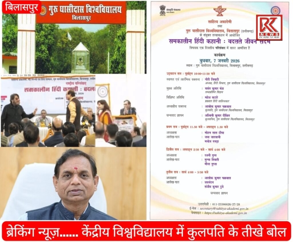 बिलासपुर (छ.ग.) : गुरु घासीदास केंद्रीय विश्वविद्यालय मेंआयोजित राष्ट्रीय साहित्यिक कार्यक्रम के दौरान अतिथि कथाकार के कथित अपमान का मामला अब लगातार गंभीर होता जा रहा है। इस प्रकरण को लेकर शहर के साहित्यकारों ने जिला प्रशासन से हस्तक्षेप की मांग करते हुए कलेक्टर कार्यालय में ज्ञापन सौंपा है। शुक्रवार को कथाकार रामकुमार तिवारी एवं वरिष्ठ उपन्यासकार द्वारिका प्रसाद अग्रवाल के नेतृत्व में साहित्यकारों का एक प्रतिनिधि मंडल कलेक्टर कार्यालय पहुँचा। प्रतिनिधि मंडल ने विश्वविद्यालय के कुलपति प्रो.आलोक कुमार चक्रवाल के व्यवहार पर नाराजगी जताते हुए मामले की निष्पक्ष जांच तथा आवश्यक कार्रवाई की मांग की। साहित्यकारों के अनुसार 7 जनवरी 2024 को गुरू घासीदास केंद्रीय विश्वविद्यालय में “समकालीन हिन्दी कहानी” विषय पर आयोजित एक दिवसीय राष्ट्रीय प्रतिसंवाद कार्यक्रम में आमंत्रित कथाकार मनोज रुपड़ा के साथ मंच से अमर्यादित व्यवहार किया गया। आरोप है कि कुलपति ने सार्वजनिक रूप से आपत्तिजनक शब्दों का प्रयोग करते हुए अतिथि लेखक को कार्यक्रम छोड़ने के लिए कह दिया, जिससे साहित्यिक जगत में रोष व्याप्त है। ज्ञापन में उल्लेख किया गया है कि किसी आमंत्रित लेखक का इस प्रकार सार्वजनिक अपमान विश्वविद्यालय की गरिमा के प्रतिकूल है तथा यह साहित्यिक संवाद, वैचारिक स्वतंत्रता और रचनात्मक वातावरण को प्रभावित करता है। साहित्यकारों ने इसे पूरे रचनात्मक समाज का अपमान बताया है।