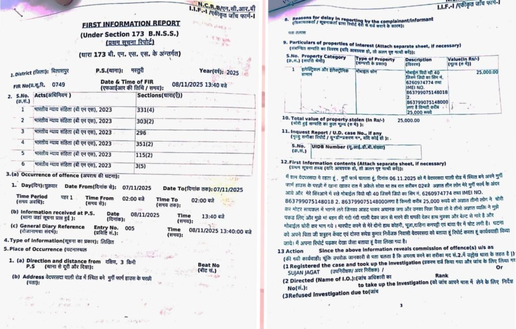 बिलासपुर : मस्तूरी थाना क्षेत्र के ग्राम वेद परसदा में बीती रात चोरी की घटना से क्षेत्र में दहशत का माहौल है। ग्रामीणों के अनुसार देर रात तीन अज्ञात चोरों ने कई घरों में घुसपैठ की और चोरी के साथ मारपीट की घटनाओं को अंजाम दिया है।जानकारी के मुताबिक, बंधवापारा वेद परसदा निवासी यश कुमार कैवर्त अपने मुर्गी फार्म में 7 नवम्बर की रात लगभग 2 बजे सोए हुए थे, तभी तीन अज्ञात चोर उनके मुर्गी फार्म में घुस आए और उनका मोबाइल फोन चोरी कर भागने लगे। आहट सुनकर जब यश कुमार की नींद खुली तब उन्होंने तीन लोगों को भागते देखा। पीछा करने पर अज्ञात चोरों ने यश कुमार पर बेल्ट और रॉड से हमला कर दिया जिससे वो गंभीर रूप से घायल हो गए। किसी तरह जान बचाकर वे घर लौटे और परिजनों को इसकी जानकारी दी। जानकारी पाकर जब परिजन पोल्ट्री फार्म गए तब यश कुमार की गाड़ी को खेत में फेंका हुआ पाया। इसके साथ ही चोरों ने ग्राम परसदा के कई अन्य घरों को भी निशाना बनाया है। जिसमें कोरबा जिला पंचायत विभाग में पदस्थ अधिकारी मांशु शुक्ला का घर भी शामिल हैं। उनके परसदा स्थित घर में भी चोरी का प्रयास किया गया, लेकिन घरवालों के जागने पर चोर भाग तो निकले लेकिन उनकी यह करतूत घर में लगे सीसी टीवी कैमरे में कैद हो गया। इधर घटना के बाद क्षेत्र में भय का माहौल है। ग्रामीणों ने मस्तूरी थाना में इसकी शिकायत करते हुए रात में पुलिस गश्त बढ़ाने और संदिग्ध व्यक्तियों पर निगरानी की मांग की है। मस्तूरी पुलिस ने पीड़ित यश कुमार कैवर्त की शिकायत पर मामला दर्ज कर जांच शुरू कर दिया है।